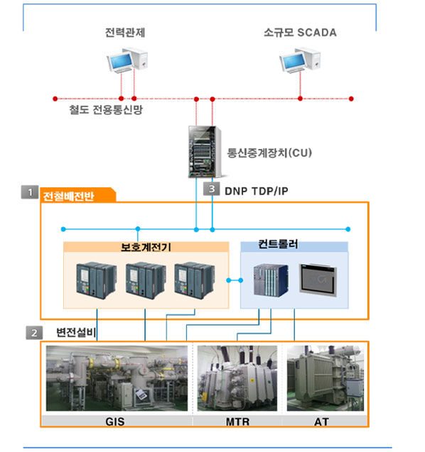 한국전력공사 , 한국철도공사, 한국가스공사, 서울교통공사 및 플랜트 설비 내 변전소의 전력 데이터를 현장 다기능 원격소장치에서 취합하여 현장 HMI 화면을 통하여 감시하고