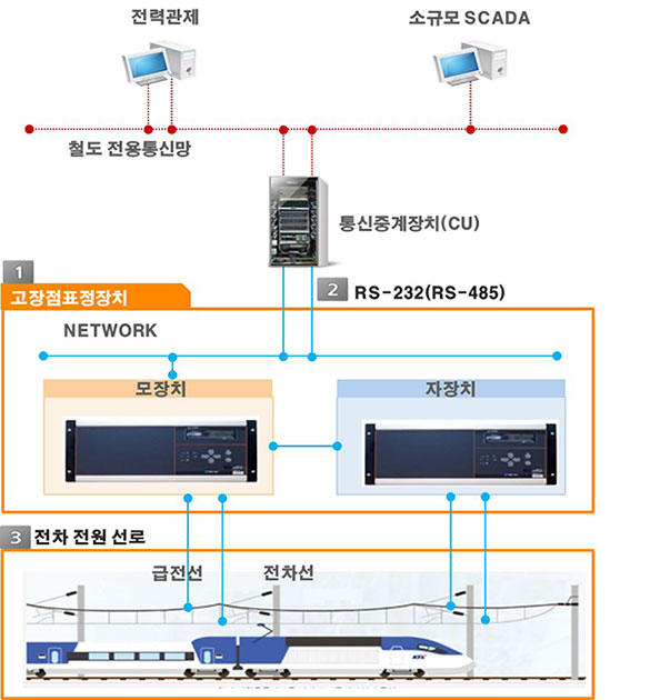 고장점 표정장치는 전차선을 포함한 급전회로와 전차선로의 지락 또는 단락사고가 발생한 경우 사고 지점을 정확히 표정하여 관제센터 및 소규모 단말장치에 전송하는 방식의 장치 및 시스템